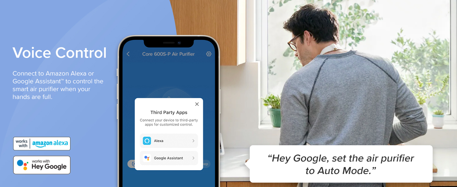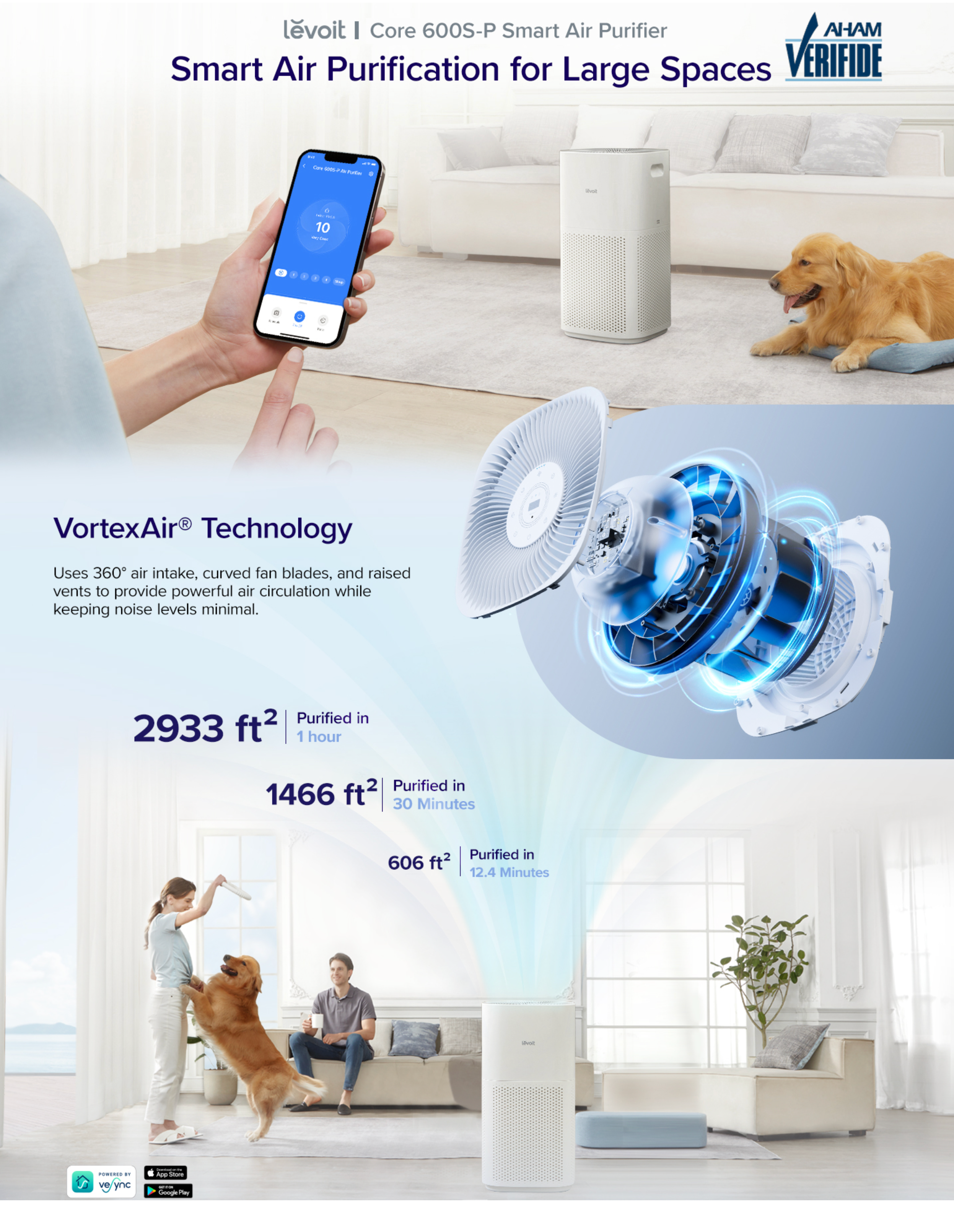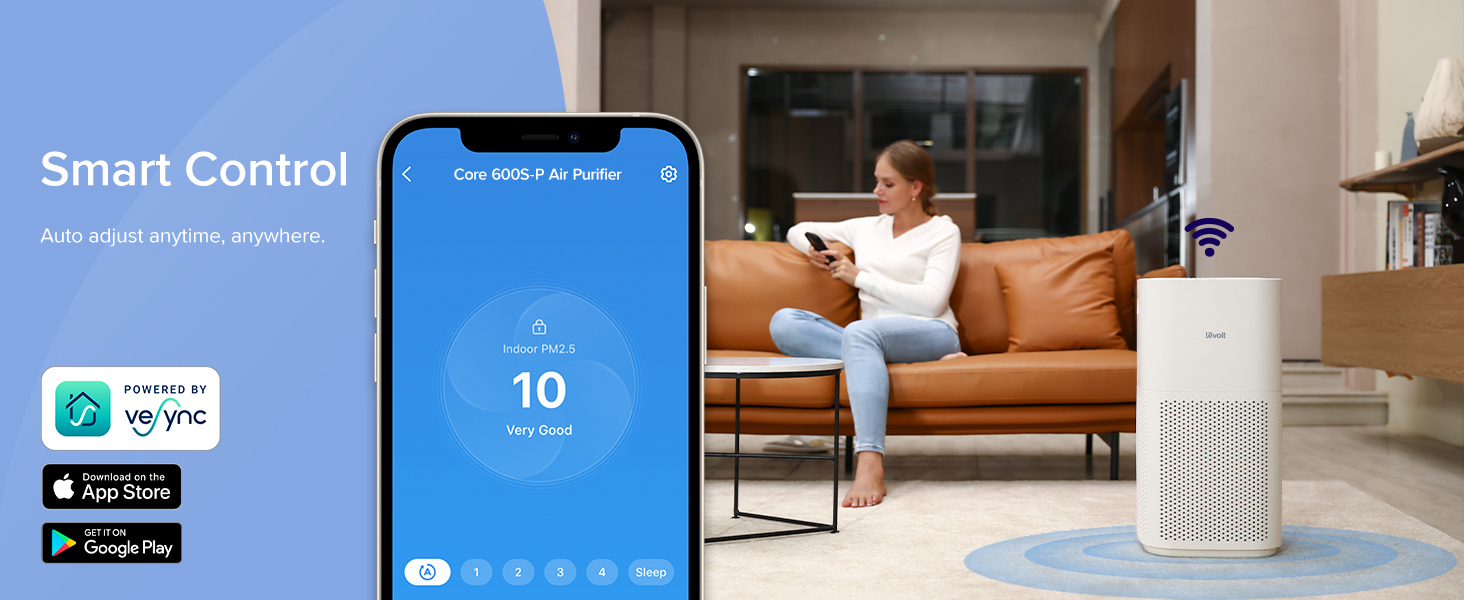 The Core 600S-P runs on LEVOIT’s VeSync app, which connects via WiFi and gives you full remote control — fan speed, scheduling, filter life tracking, air quality history graphs, and real-time PM2.5 readings. The app works on both iOS and Android, and integrates directly with Amazon Alexa and Google Assistant for voice commands.