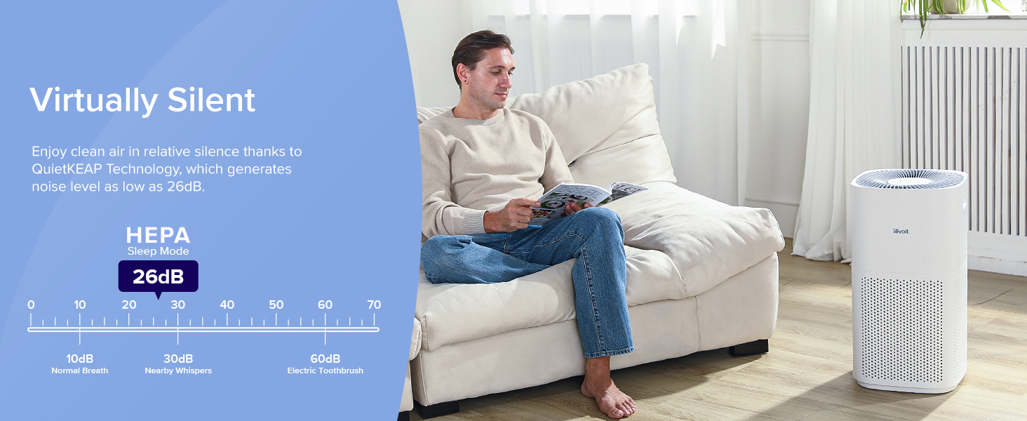 - ✓Ultra-quiet 26 dB sleep mode keeps clean air flowing without disturbing rest