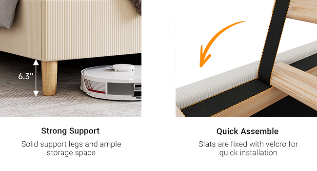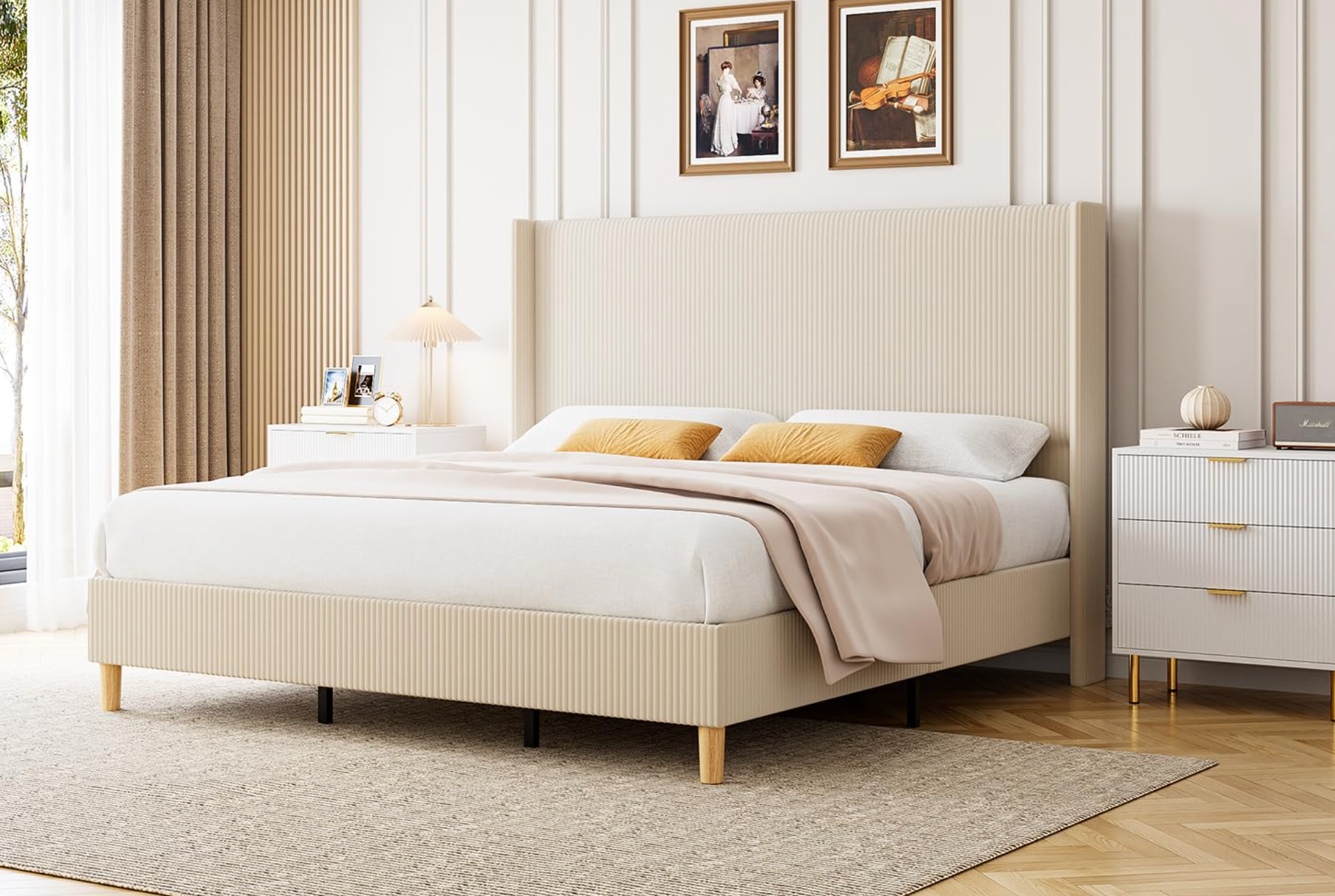 The build follows a proven formula: a high-quality metal internal frame with center support legs provides the structural backbone, while the exterior is fully wrapped in soft corduroy fabric with sponge padding underneath. The wingback headboard isn’t just decorative—it’s functional. The vertical channel tufting creates a cushioned surface that’s genuinely comfortable to lean against when you’re reading in bed or watching your phone before sleep. For style-focused decorators, the creamy beige colorway is intentionally neutral: it pairs effortlessly with white bedding, earthy tones, or even bold accent walls.